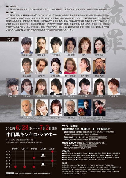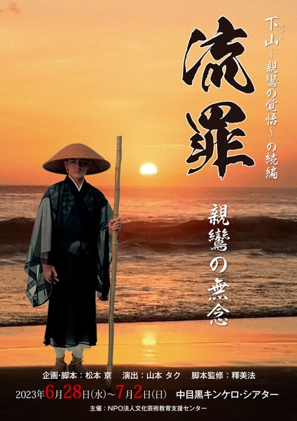 NPO法人文化芸術教育支援センター主催、『流罪~親鸞の無念~』が2023年6月28日 (水) ~2023年7月2日 (日)に中目黒キンケロ・シアター(東京都目黒区青葉台1-15-11)にて上演されます。
