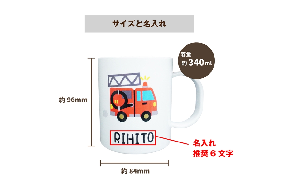 はたらくくるまマグカップは、消防車やダンプカー等のはたらくくるまのデザインに名入れが出来る商品です。こちらのマグカップを”俺流総本家”楽天市場店にて通常価格1,600円から10%OFFクーポン使用で1,440円で販売いたします。