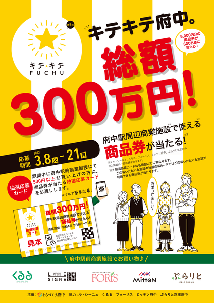 8回目となる今回は、府中駅周辺商業施設で使える商品券が当たる総額300万円商品券キャンペーンを実施します。