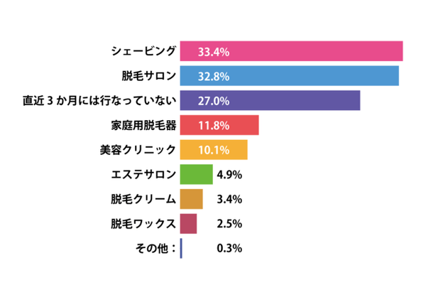 2020年4月に行ったアンケートでは、「脱毛サロン」77%、「シェービング」32.7%、「脱毛クリーム」6.0%と全体の数字が大きく伸びています。