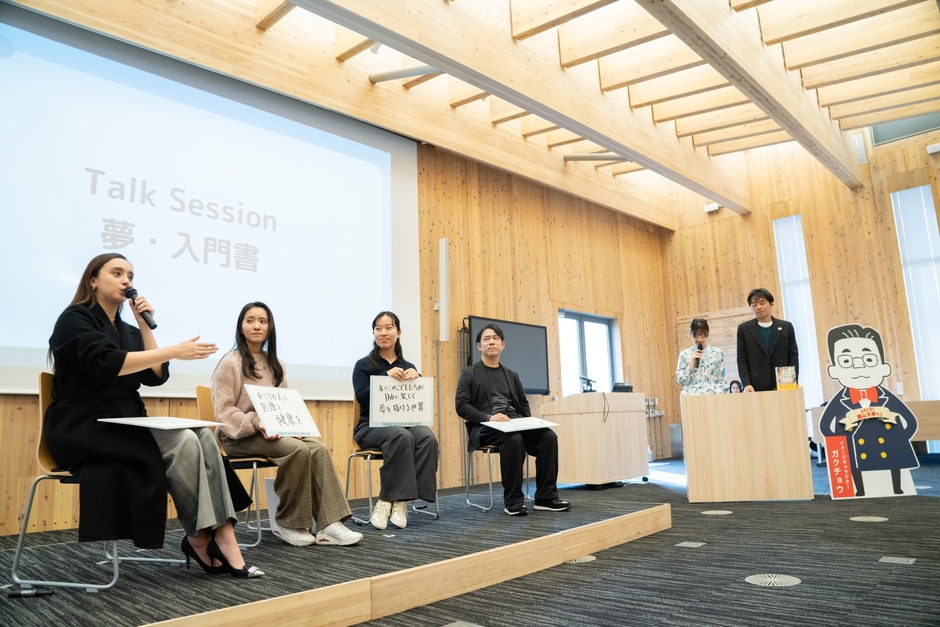 ・夢の入門書: ニコルさん、横井副学長、そして2名の岡山大学生が登壇し、「夢」をボードに書き込み、それぞれのリアルな想いを語り合いました。
