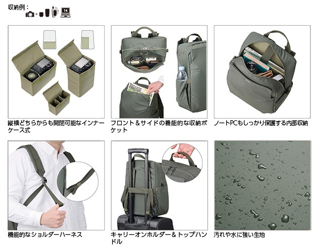日常のスタイルに溶け込む都会的なシルエットと、多様なシーンに対応する柔軟性の高い収納力を兼ね備えたモデルです。着脱可能なインナーケース仕様に加え、14インチPCスリーブやA4対応ポケットを備え、機材と日用品をバランスよく収納できます。水に強い素材やキャリーオン機能など実用性も充実し、ケースを外せば普段使いのバックパックとして活躍。わずか約850gの軽量設計で日常から旅先まで軽快に持ち運べます。