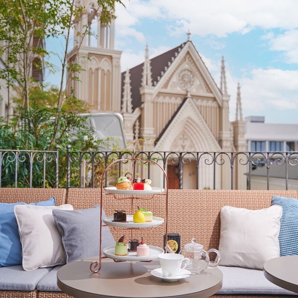 まるでお城のような外観の大聖堂を望むテラス席と、海をモチーフとしたバーが特徴的なラウンジ席を備えるハワイアン・ラグジュアリーなラナイテラスでご堪能いただくのは、日本の“夏祭り”をイメージし、サマーフルーツでカラフルに仕上げた「夏祭りアフタヌーンティー」。ウェルカムドリンクには瓶のラムネをご用意しているほか、フランスの老舗紅茶ブランド・マリアージュ フレール社の紅茶やフレーバードティーも飲み放題でご提供いたします。