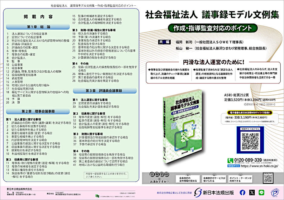 新日本法規出版株式会社(所在地:愛知県名古屋市中区、代表取締役社長:河合誠一郎)は、新刊『社会福祉法人 議事録モデル文例集-作成・指導監査対応のポイント-』を2026年3月5日(木)に発売いたしました!