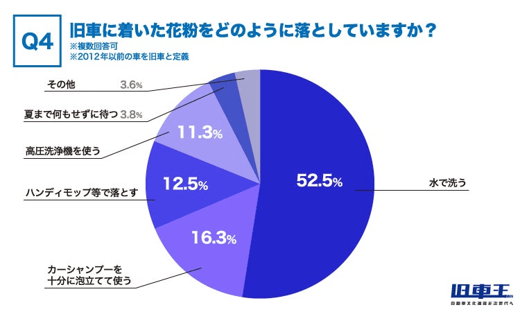 Q1で「はい」と答えた方に、旧車に着いた花粉をどのように落としているか聞いてみると、半数以上の52.5%が「水で洗う」と回答しました。