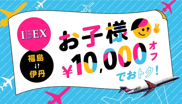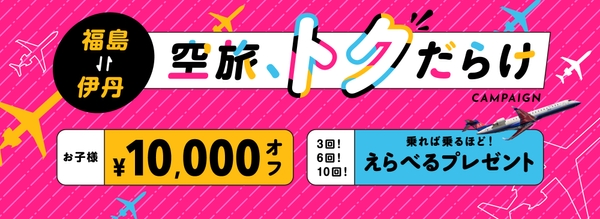 と題して、IBEX福島=伊丹線の小児運賃が1万円引きとなる「お子様¥10,000オフでおトク!」キャンペーンと、同路線に“乗れば乗るほど”プレゼントが選べる「乗れば乗るほど!おトク」キャンペーンを同時に展開いたします。