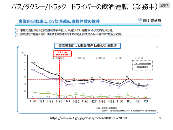 当社は、年間2万人いる飲酒運転者へのアルコール・インターロック装着は、法制化されるべきと考えています。また、プロドライバーの飲酒運転ゼロの実現なくして、年間2万件以上もある日本の一般ドライバーによる飲酒運転ゼロ実現は不可能であるとも考えています。運輸行政は、決して、悪意ある市井の飲酒運転者に、「プロドライバーでさえ飲酒運転している」と言わせない政策を実現すべきである。