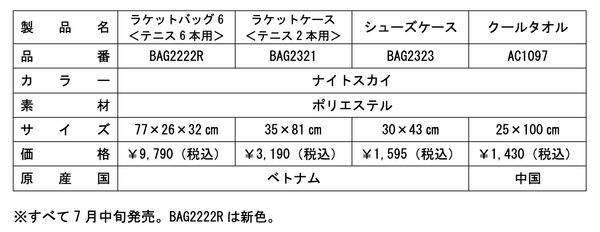 ラケットとデザインを連動させたバッグとタオルとのトータルコーディネートをお楽しみいただけます。