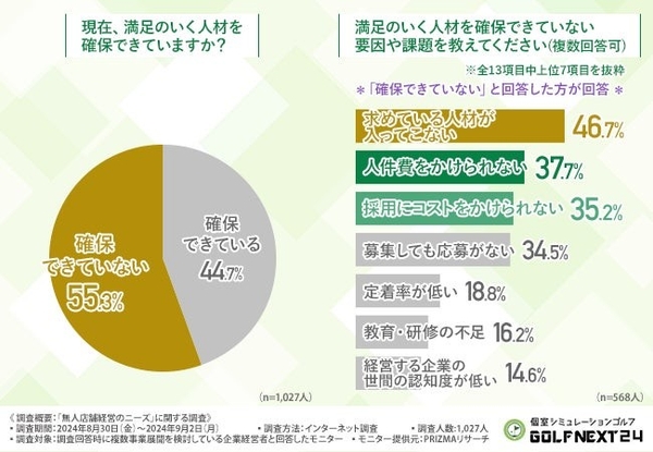 そこで、「現在、満足のいく人材を確保できていますか?」と質問したところ、6割近い方が『確保できていない(55.3%)』と回答しました。