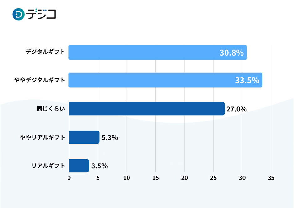 業務でギフトを扱う際の運用負担について、「デジタルギフト(無形)」と「リアルギフト(有形)」を比較しました。どちらがより運用が楽かと聞いたところ、「デジタルギフト」が30.8%、「ややデジタルギフト」が33.5%で、64.3%が「デジタルギフト(無形)」寄りという結果に。担当者の多くがデジタルギフトの方が運用面でより優れていると感じていることが判明しました。