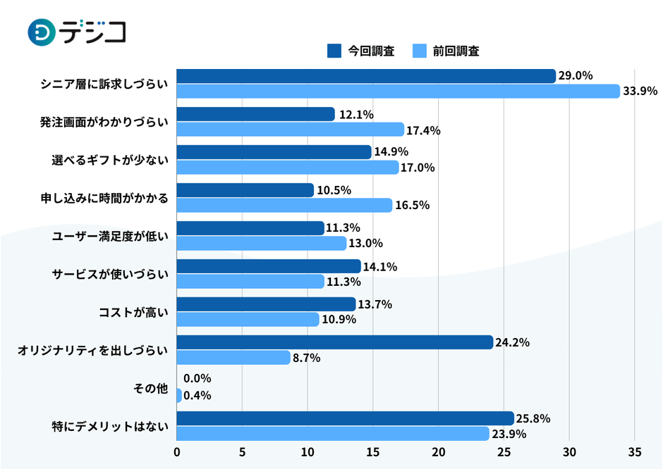 ・デジタルギフトのデメリットとして29.0%が「シニア層に訴求しづらい」と回答、前回の33.9%より改善