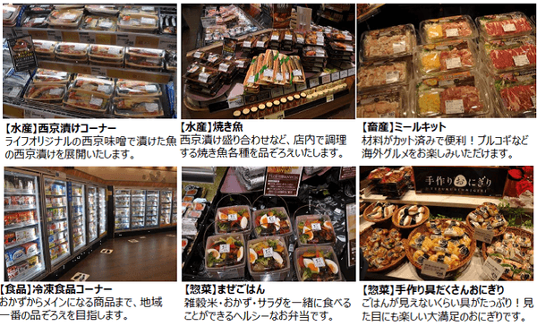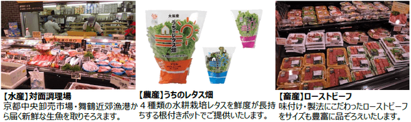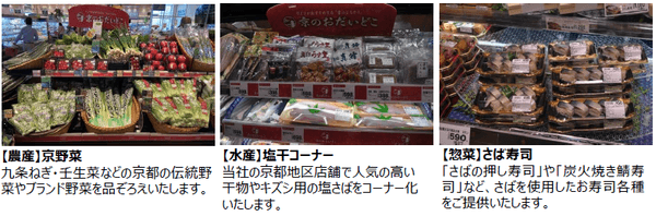 地元にお住まいの方にも、遠方からお越しの方にもお楽しみいただけるよう、京野菜や漬物、京都地区店舗で人気の商品など、地域ニーズに対応した京都自慢のおいしさを取りそろえます。また、鮮度抜群の生鮮食品や時短・簡便商品、ワンランク上のこだわり商品など、コンパクトな売り場ながら幅広い品ぞろえでお客様をお迎えいたします。