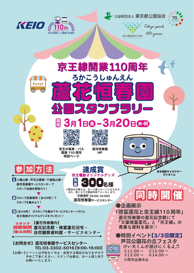 京王線開業110周年を記念し、京王線沿線の公園である「蘆花恒春園」にてスタンプラリーを3月1日(金)から3月20日(水・祝)に開催します。公園内に設置された全4か所のスタンプを集めた先着300名様に「京王電鉄オリジナルグッズ」をプレゼントします♪