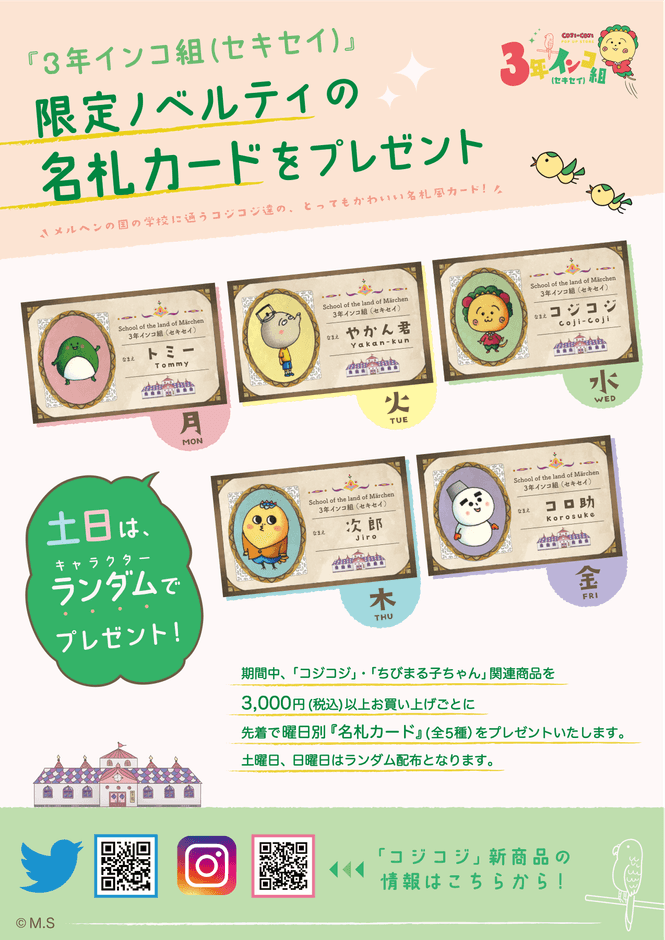 期間中、「コジコジポップアップショップ 3年インコ組(セキセイ)」で「コジコジ」・ 「ちびまる子ちゃん」関連商品を3,000円(税込)以上お買い上げいただいたお客様に名札カードを1枚プレゼントいたします。
