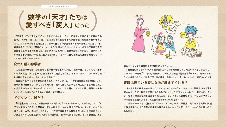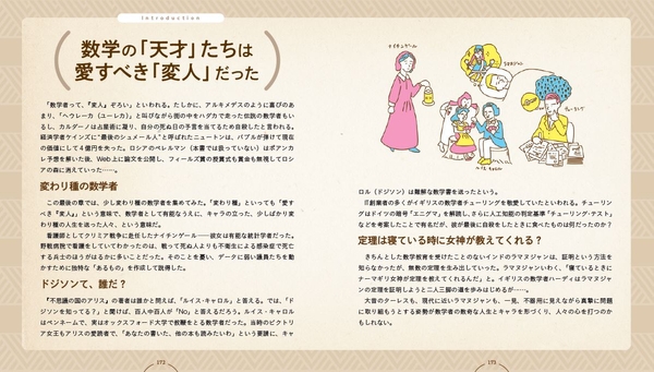 本書では、「数学界の2大巨人」「世界3大数学者」と呼ばれるアルキメデス、ニュートン、ガウス、オイラーなどを中心に30人以上の数学者を取り上げました。彼らのユニークなエピソードと学説との関係や、生まれ育った国の状況など、偉業が生まれた時代背景にも触れていきます。