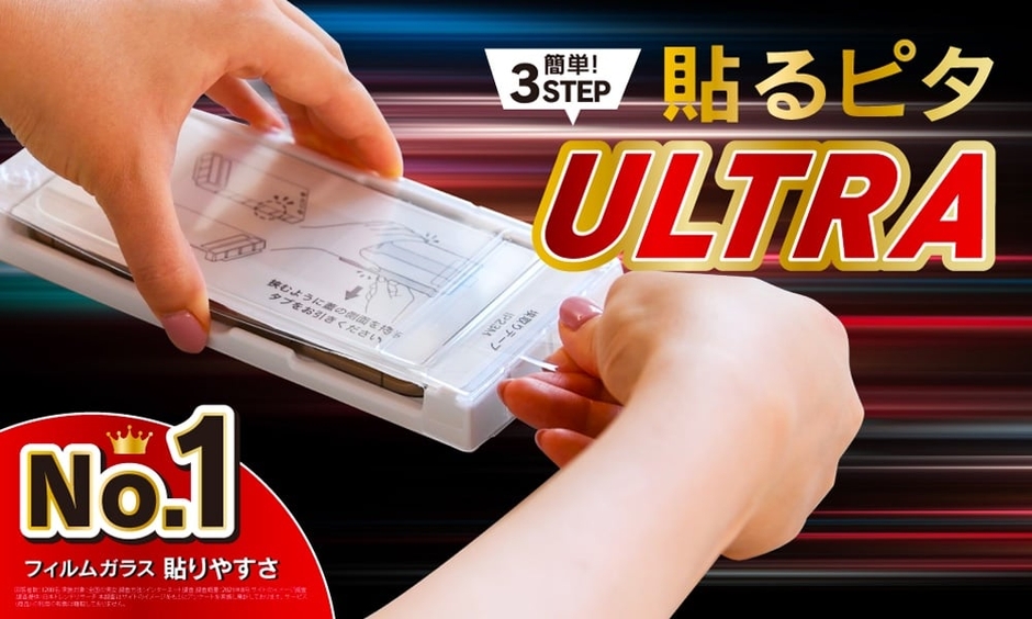 画面保護ガラス付属の貼り付けツールが「貼るピタULTRA」に進化! 昨年の貼るピタMAXより作業工程を減らし、さらにはみるみる気泡が抜ける仕様に改良しました。