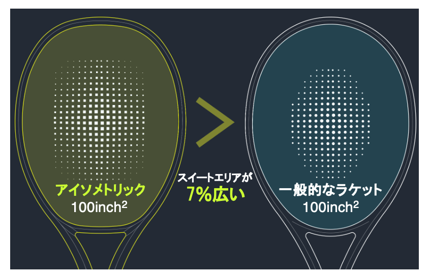 アイソメトリックとは、スウィートエリアを拡大させるヨネックス独自の形状理論。縦横のストリングの長さを均等に近づけることで、一般的な円形ラケットに比べ上下左右に7%※広いスウィートエリアを実現。