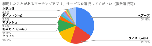 実際に利用したことのあるサービスの結果では、「Pairs(ペアーズ)」が34.8%で最多、次いで「with(ウィズ)」20.1%、「tapple(タップル)」14.2%となりました。