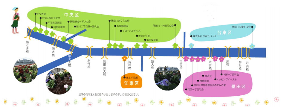 隅田川の両岸、隅田川テラスにある21か所の花壇のいずれかになります。