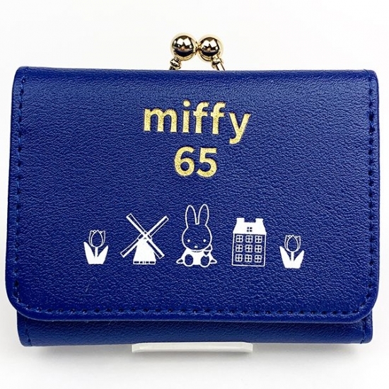 お馴染みの三つ折り財布にも、65周年グッズが登場です。こちらはシックなネイビーに、白いプリントのミッフィーたち。上には65の文字も♪
