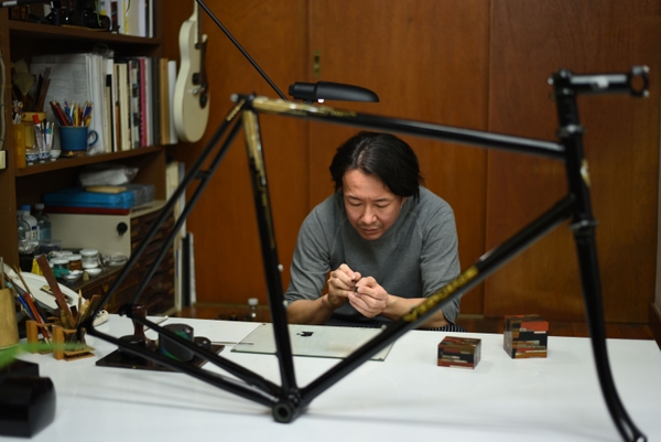 奈良時代より永く受け継がれてきた蒔絵や螺鈿などの漆芸の技術を鍛え、進化させてきた漆芸家 服部一齋。ものそのものの魅力を最大限に際立たせたいという想いのもと漆芸と向き合う服部氏の描くデザインは、自転車フレームそのものの構造と一体化し、VIGOREで受け継がれてきた、細部に渡る線と曲線の美しさを際立たせています。漆芸と自転車で生み出された研ぎ澄まされた美しさは、時間をかけて紡がれるものに溢れる京都という地で培われたその感性を最大限に表現されていると感じています。まさに「知足」にかける想いを体現したものが完成しました。