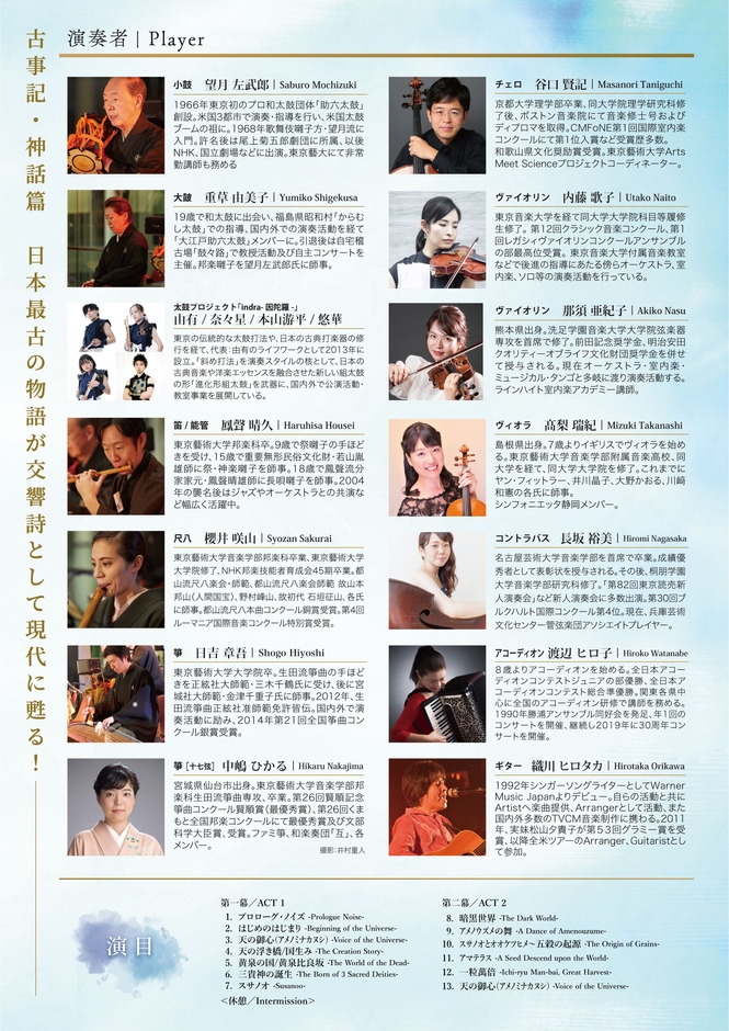 この八百万の神さまの物語が描かれているのが日本の神話です。今回の舞台では、邦楽、洋楽の編成による演奏と長塚京三氏の語りで、宇宙の始まり・ビッグバンから八百万の神さまが次々と生まれてきて、やがて五穀の種が誕生するまでのストーリーをわかりやすく、より深く理解頂けるよう展開します。