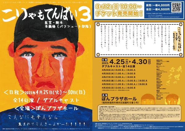 株式会社エンターアーツプロモーション/株式会社にゃんにゃんカムカム/株式会社ワタナベエンターテインメント主催、『こりゃもてんばい3』が2023年4月25日 (火) ~2023年4月30日 (日)にぽんプラザホール(福岡県福岡市博多区祇園町8番3号ぽんプラザ)にて上演されます。