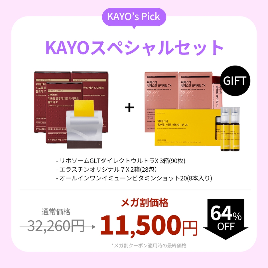 今回のスペシャルコラボセットでは、エスターフォーミュラの人気商品3種「リポソームGLTダイレクトウルトラX」「エラスチンオリジナル7X」「オールインワンイミューンビタミンショット20」を1セットにまとめました。