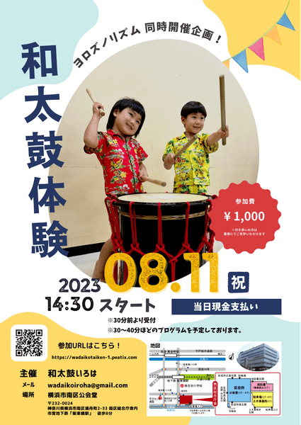 和太鼓いろは主催、『ヨロズノリズムII』が2023年8月11日 (金・祝)に横浜市南公会堂(神奈川県横浜市港南区港南中央通10-1)にて開催されます。チケットはカンフェティ(運営:ロングランプランニング株式会社、東京都新宿区、代表取締役:榑松 大剛)にて発売中です。