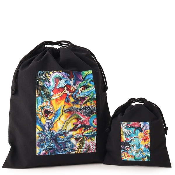 「最強王図鑑」らしい鮮やかなプリントとロゴ刺繍がデザインされた巾着袋は、通学にちょうどいい大きさが2サイズセットになっており、サイズ大は体操着や学童の着替えがすっぽり入るサイズ、サイズ小は給食袋などにピッタリなサイズで様々なシーンで活躍するアイテムです。