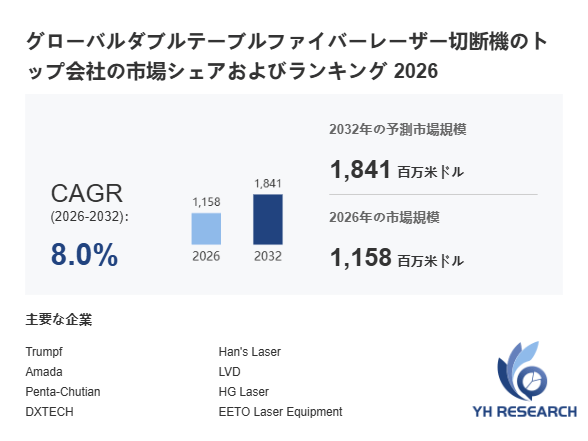 YHResearch調査チームの最新レポート「グローバルダブルテーブルファイバーレーザー切断機のトップ会社の市場シェアおよびランキング 2026」によると、2026年の1158百万米ドルから2032年には1841百万米ドルに成長し、2026年から2032年の間にCAGRは8.0%になると予測されています。