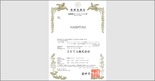ECキュレーション・ハッシュタグ・レビュー・EC商品検索・OMOソリューションを開発販売するコマースとCXのリーディングカンパニーであるZETA株式会社(本社:東京都世田谷区、以下ZETA)は、『HASHTAG』の商標登録が完了したことをお知らせいたします。