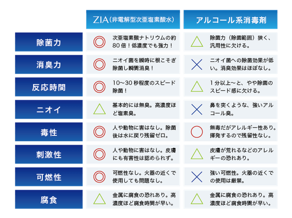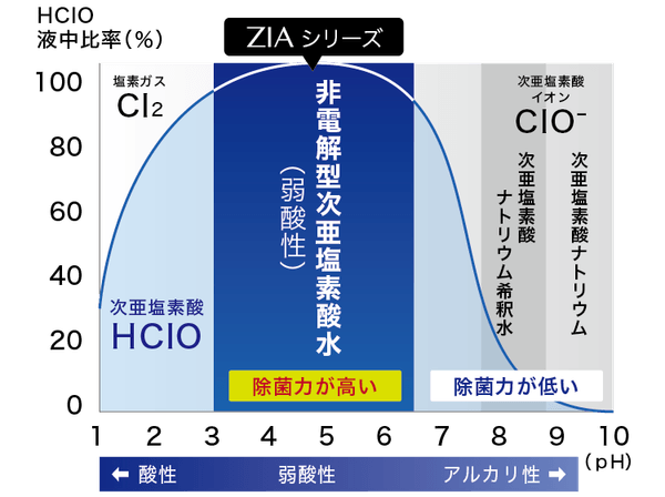 一方、弱酸性の非電解型次亜塩素酸水は除菌力が高く、安全です。ZIAシリーズはpH6.5〜3.0の弱酸性の間で、1年程度の安定長期保存を実現しています。