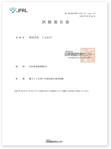 「非電解次亜塩素酸水ZIA」は、第三者機関にて「安全性」と「除菌効果」の試験を実施し、ZIAは人に対して一切無害との結論が実証されております。