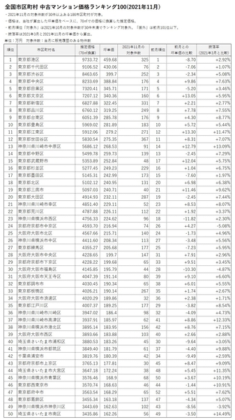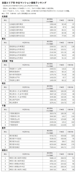 「マンションレビュー」2021年11月 全国市区町村 中古マンション価格ランキング100を発表