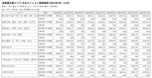 ・東京都内各エリアでの2021年11月の推定価格は以下の通り。