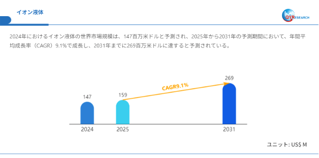QYResearchが発表した新たな市場調査レポート「イオン液体―グローバル市場シェアとランキング、全体の売上と需要予測、2026~2032」によると、世界のイオン液体市場規模は2024年の約147百万米ドルから2025年の159百万米ドルへと順調に拡大すると見込まれ、予測期間中は年平均成長率(CAGR)9.1%で成長し、2031年には269百万米ドルに達すると予測されている。