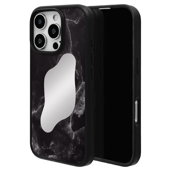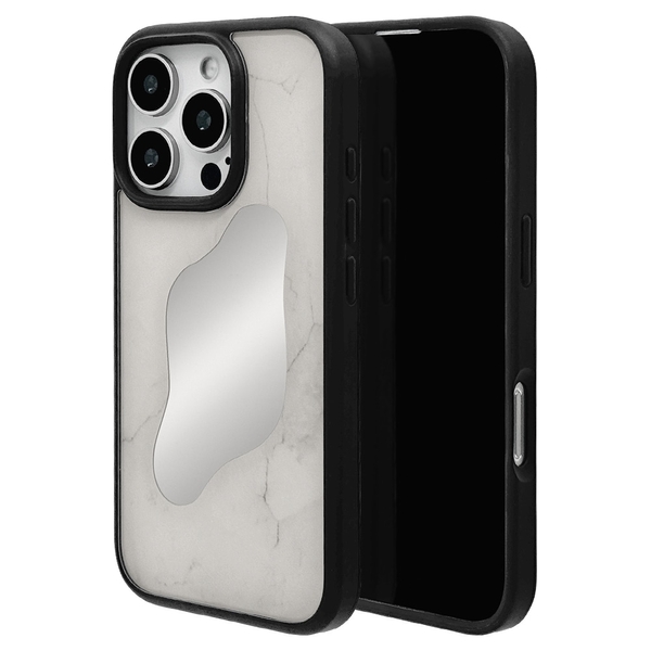 このハイブリッド背面ケースは、大理石調のデザインにミラーがアクセントとして付いており、身だしなみのチェックが可能です。背面は傷に強いポリカーボネート素材、側面は弾力のあるTPU素材で衝撃から端末を保護し、着脱も簡単です。画面を下向きに置いてもディスプレイが直接触れにくい設計になっています。