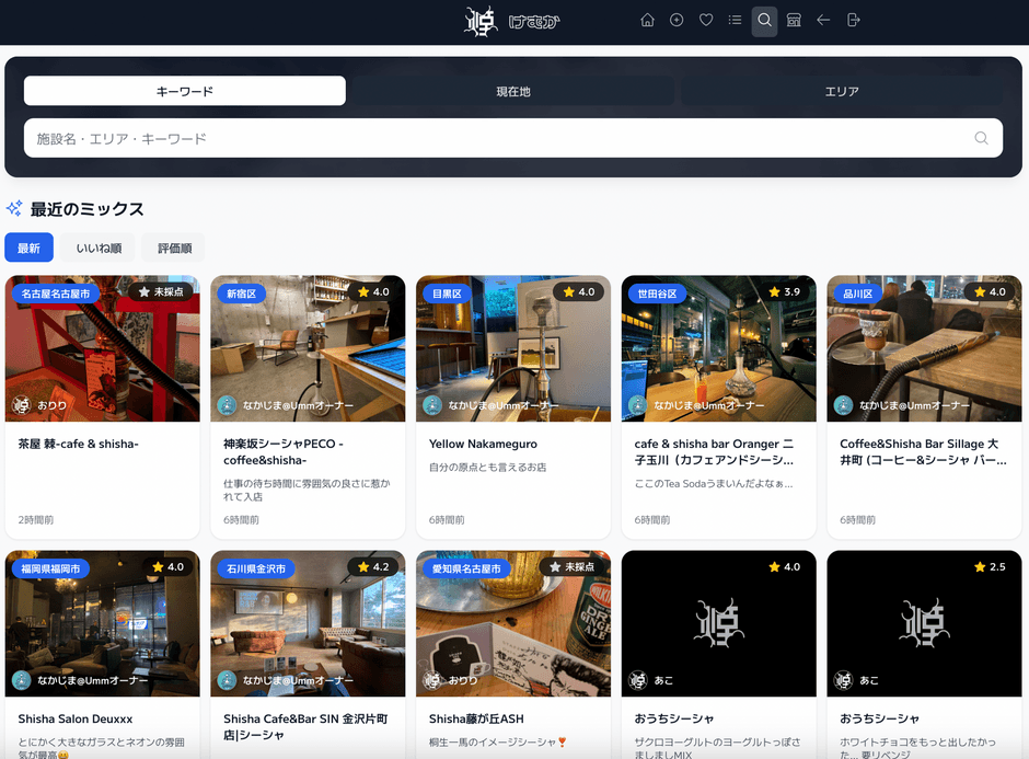 フレーバーの組み合わせを写真・評価(5段階)・コメント付きで記録し、自分だけのフレーバーノートを作成できます。日付や店舗情報も合わせて管理できるため、いつでも過去の美味しかったミックスを思い出すことが可能です。全国シーシャ店舗データベース