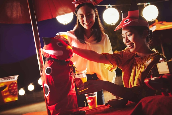 当ビアガーデンではスタッフもゲストも赤べこに扮して宴を楽しみます。ゲストには、赤べこに変身できるオリジナルのお面と、うちわをプレゼントします。うちわは、赤べこのスタンプを用いて、ゲストが自由に絵柄をつけらます。べこジェニックな赤べこグッズをおそろいで身に着けることで、より一層ビアガーデンを楽しめます。