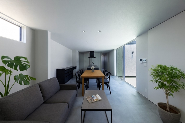 本モデルハウスで目指した室内空間は「スタイリッシュモダン」です。床には、モルタル柄のフロアタイルを採用。巾木(壁と床の境目に設置する部材)は通常60mmのところをわずか9mmとし、ホワイト塗装を施しています。窓枠も見えないように工夫をしたりとディティールにこだわったモデルハウスです。