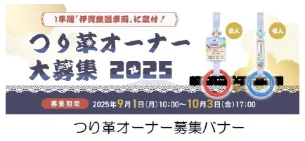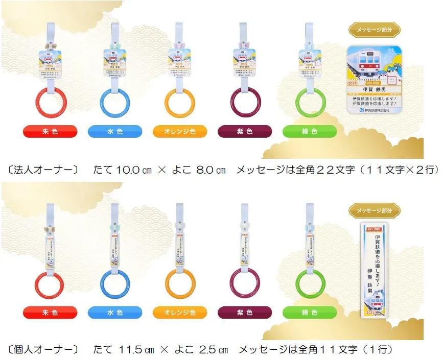 伊賀鉄道および伊賀市では、2025年9月1日(月)午前10時より、「いがてつオンラインショップ」にて2025年度つり革オーナーの募集を開始します。今年度も、広告・宣伝にもお使いいただける大型メッセージボード付の「法人オーナー」様の募集も引き続き実施します。また、つり革の「さや」を利用したメッセージボードのデザインを「オリジナル車両」と「ふくにん」に一新し、「リボン」を取り付け「法人オーナー」様、「個人オーナー」様の商品として募集します。今年度は、「5色のつり輪」と「リボン」でメッセージボードを飾ります。