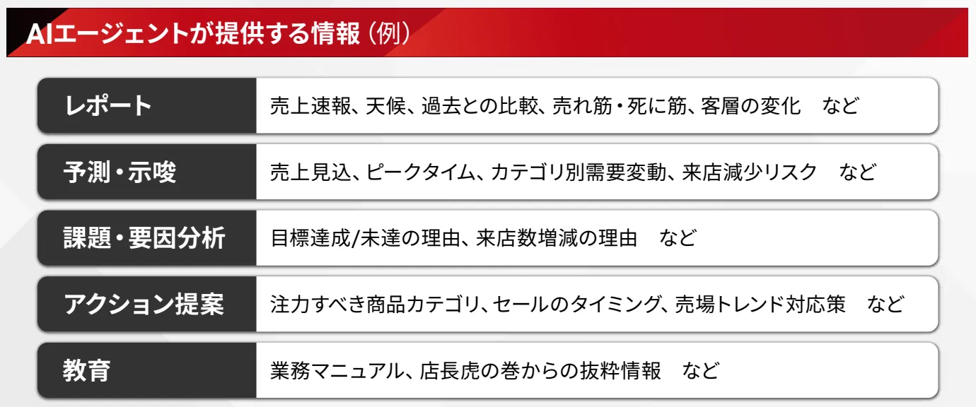 「店長支援AIエージェント(α版)」が提供する情報は、下記を想定しています。