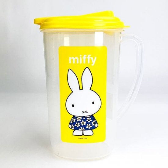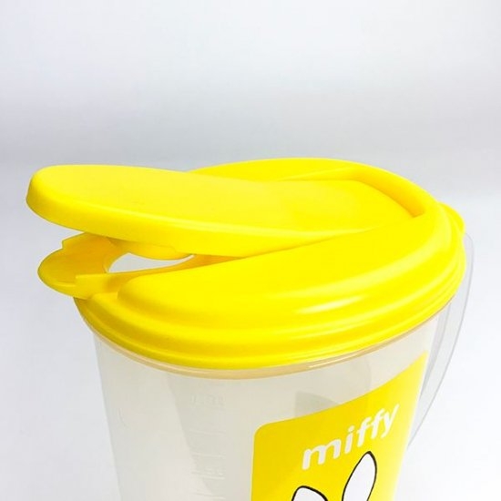 ミネラルウォーターや麦茶などをキープしておける、ピッチャーもご紹介します。クリアなピッチャーに、花柄ワンピのキュートなミッフィーのイラスト♡背景はフタと同じイエローカラーになっています。
