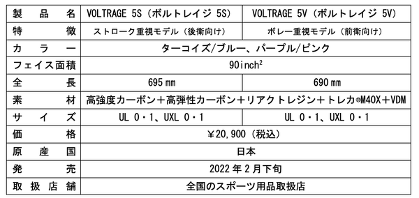 シリーズ最大の飛びと心地よい打球感を実現したソフトテニスラケット「VOLTRAGE(ボルトレイジ)5S/5V」、 優れたホールド性と高い打球音を追求したストリング 「CYBER NATURAL GALE(サイバーナチュラルゲイル)」 2022年2月下旬より発売