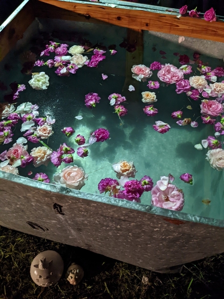 お月見には欠かせないススキなど季節のお花で会場を装飾し、バラの水風呂など特別な演出もいたしました。曇り空のスタートでしたが、夜には美しい月が雲間から姿を現し、参加者は美しい月と焚火の幻想的な光の中、思い思いにテントサウナで整い、BBQや映画上映会なども楽しみました。