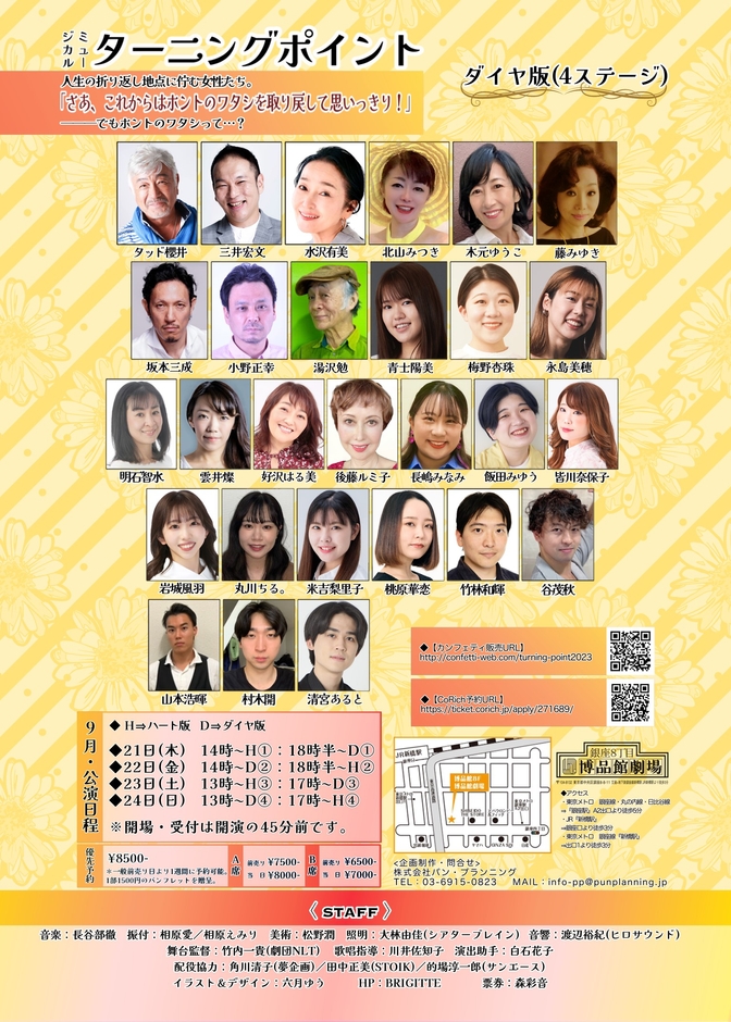 株式会社パン・プランニング主催、『ミュージカル ターニングポイント』が2023年9月21日(木)~9月24日(日)に銀座博品館劇場(東京都中央区銀座8丁目8-11)にて上演されます。