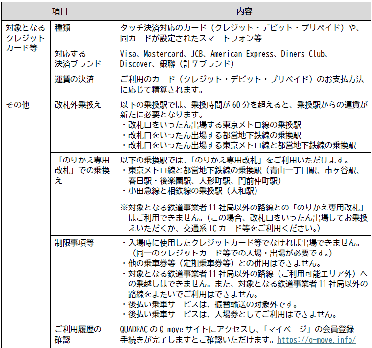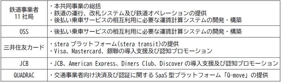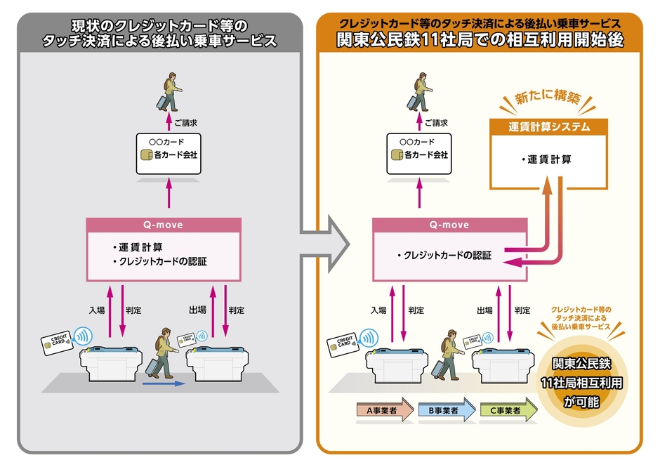 この新たな運賃計算システムと、三井住友カードが提供する公共交通機関向けソリューション「stera transit」及びQUADRACが提供するSaaS型プラットフォーム“Q-move”が連携することにより、関東での後払い乗車サービスの相互利用を実現いたします。
