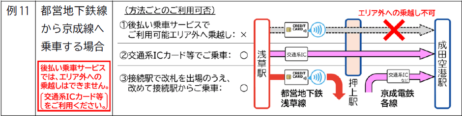※ご注意:後払い乗車サービスは、同一のクレジットカード等で自動改札機等を入場・出場してご利用が必要です。他の乗車券等と併用してご利用はできませんのでご注意ください。