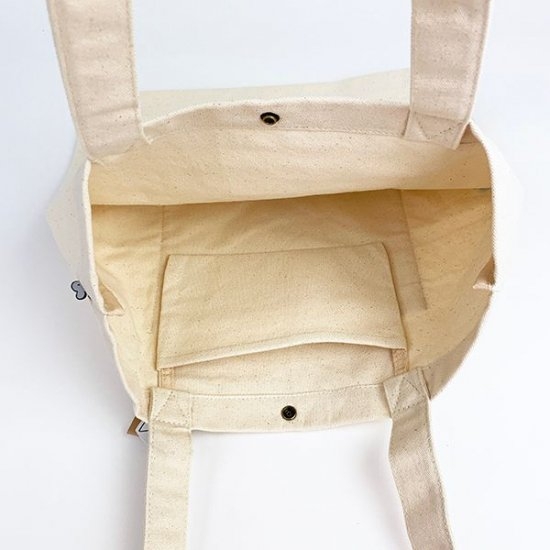 トートバッグ内部はこちらになります。上部にボタン、内ポケットがついています。サイズは、39×40×10cmです。たっぷり収納できる優れものです◎